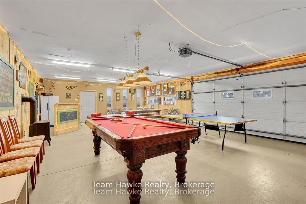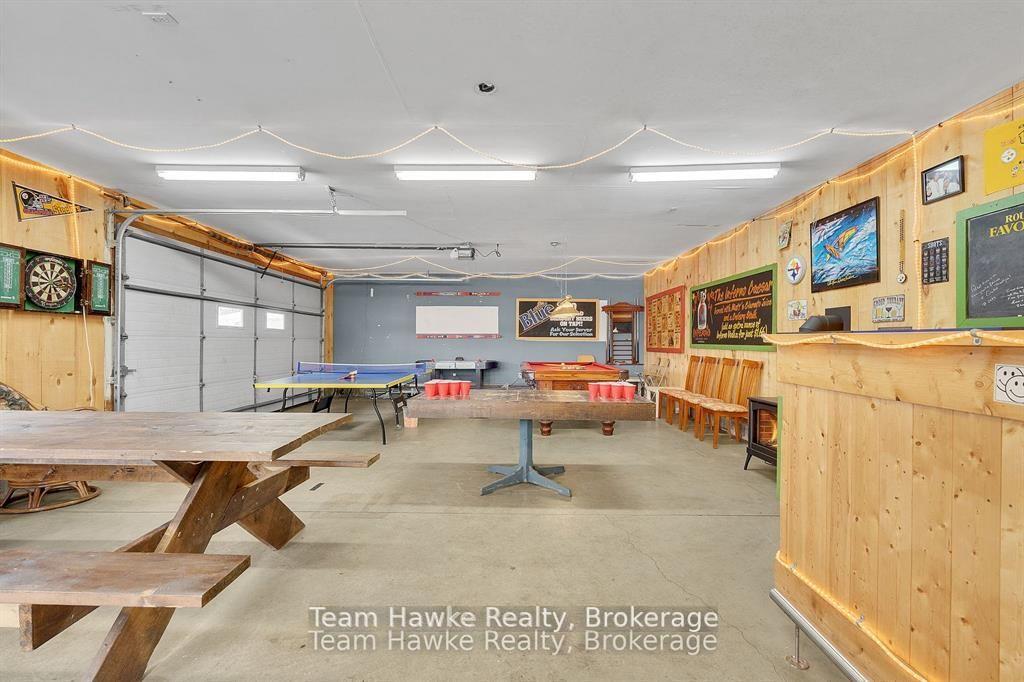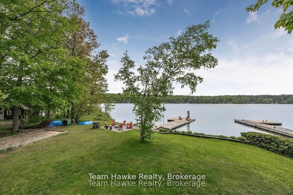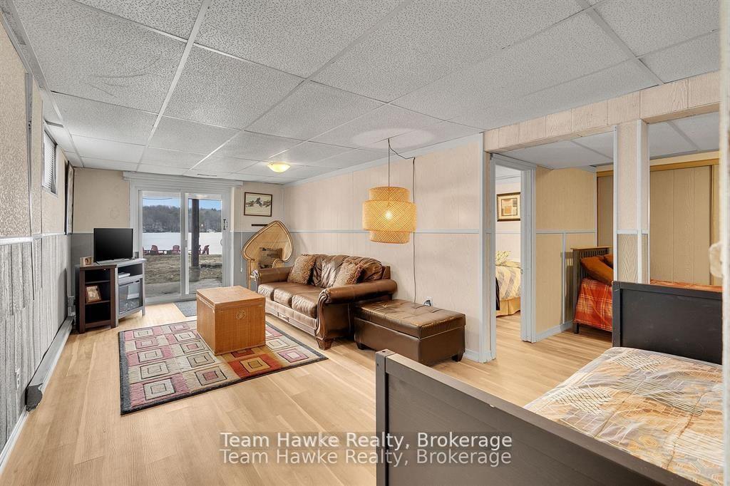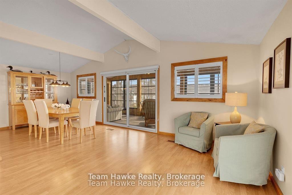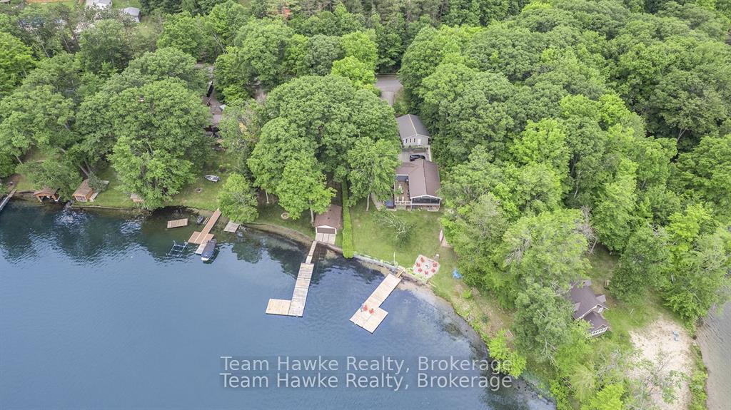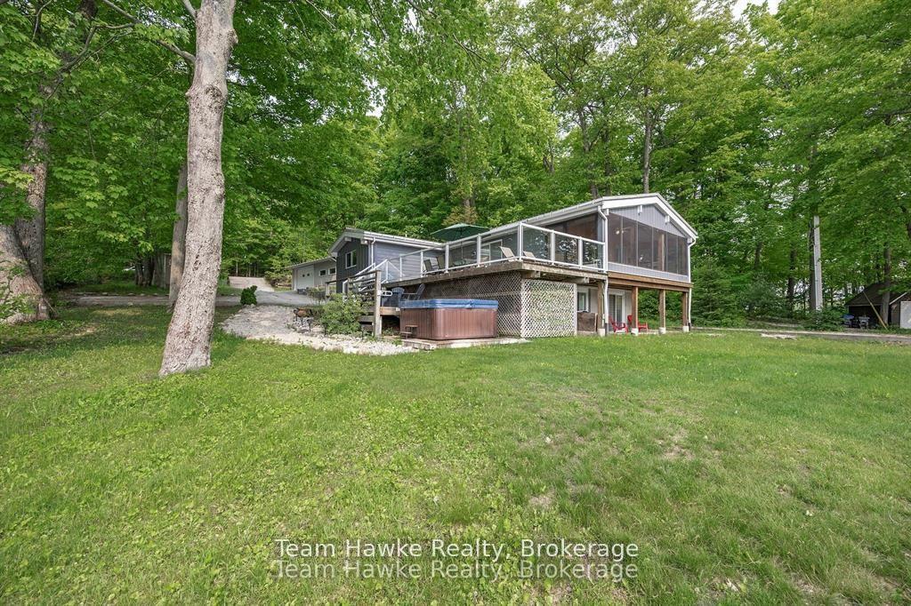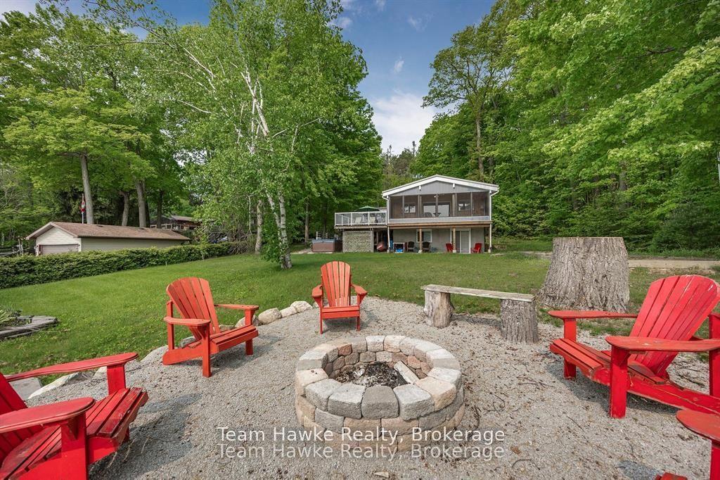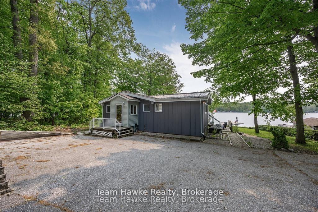 Escape the city and embrace lakeside living! Located 15 minutes from Penetanguishene and under 2 hours from the GTA, this exceptional four-season lakefront home is nestled on a beautifully landscaped 3/4 acre lot with hundreds of feet of private shoreline. The calm, swimmable waters and shallow sandy entry create warmer temperatures that are ideal for families; a highly sought-after feature compared to larger, busier lakes. Offering just under 2,400 square feet of finished living space, this spacious and thoughtfully designed home features 3 bedrooms and 3 bathrooms, perfectly suited for full-time living or a luxury recreational retreat. The main-floor primary suite includes a private ensuite and custom built-in wardrobes, while the open-concept living and dining areas flow seamlessly into an enclosed, lake-facing sunroom with southeastern exposure - the perfect place to enjoy morning light and lake breezes. Sunroom windows can be removed for summer use, with screens remaining in place for convenience. The kitchen offers generous counter space, ample cabinetry, and a built-in dishwasher. The walkout basement features an additional bedroom and two versatile bonus rooms, perfect for guests, a home gym, office, or hobby area, as well as a freshly renovated 2 piece bathroom. Outdoor living here is equally impressive. Relax in the hot tub, gather around the fire pit, or enjoy games on the bocce ball court, or horseshoe pits located on the point. The fully insulated and heated detached double garage (approximately 800 sq ft) is an entertainer's dream, complete with a bar, table games and lounge, making it the ultimate year-round hangout space. Additional highlights include a private dock, large paved driveway, forced-air gas heating, and central air conditioning for year-round comfort. Best of all, this turnkey waterfront property is being sold fully furnished, simply bring your swimsuit and start enjoying lake life from day one.